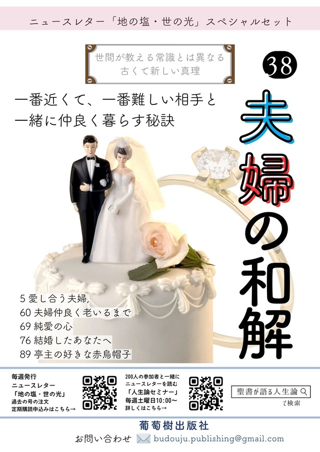 一番近くて、一番難しい相手と 一緒に仲良く暮らす秘訣 5 愛し合う夫婦, 60 夫婦仲良く老いるまで 69 純愛の心 76 結婚したあなたへ 89 亭主の好きな赤烏帽子