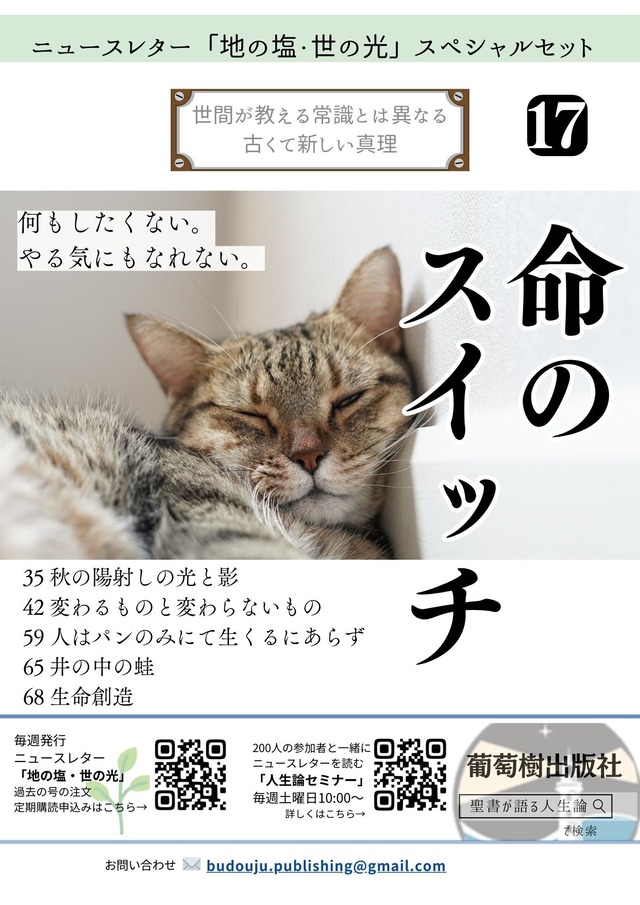 何もしたくない。 やる気にもなれない。 35 秋の陽射しの光と影 42 変わるものと変わらないもの 59 人はパンのみにて生くるにあらず 65 井の中の蛙 68 生命創造